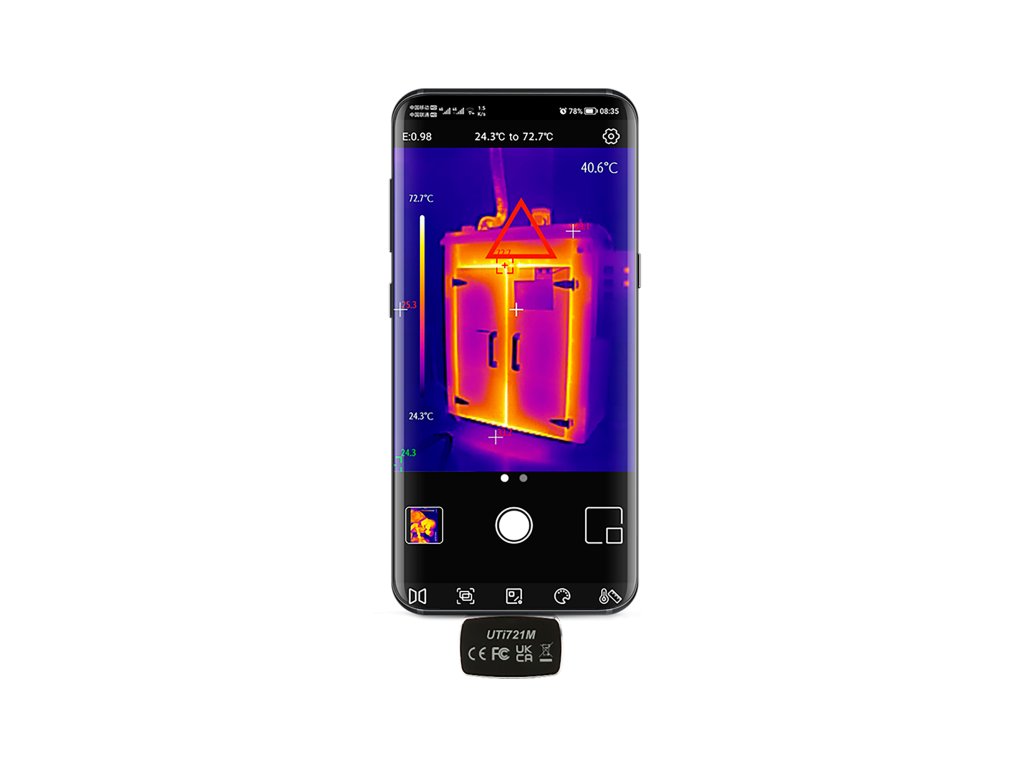 Uni-T UTi721M ima izjemno kompaktne dimenzije 33 x 28 x 11 mm in tehta le 12,3 g, kar jo naredi enostavno za prenašanje in uporabo kjer koli. Kamera se povezuje preko USB-C priključka in je združljiva z napravami s sistemom Android 6 ali novejšim, kar omogoča hiter dostop do podatkov in njihovo analizo na pametnem telefonu ali tabličnem računalniku.