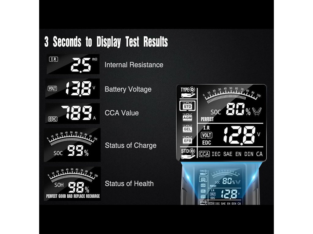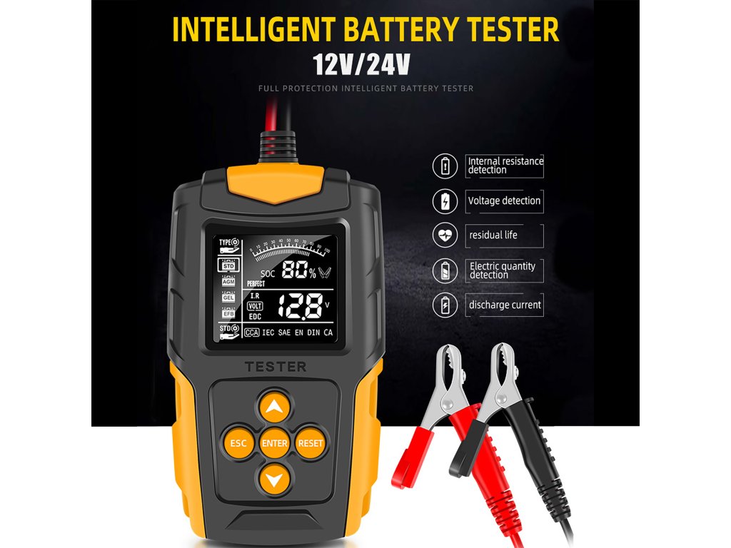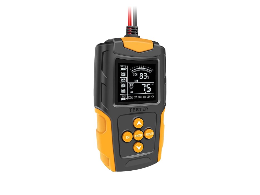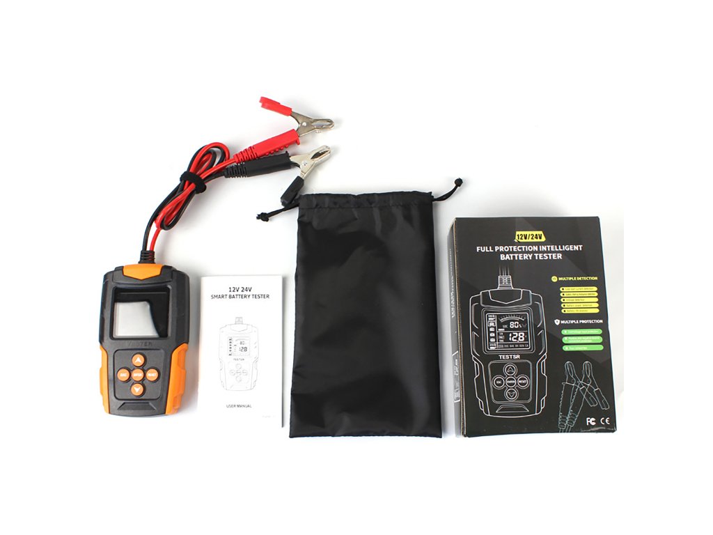 Tester je združljiv z akumulatorji: Kislinski/Svinčeni (navadni/običajni akumulatorji) AGM ploščati AGM spiralni Gelasti EFB Testiranje akumulatorjev 12V in 24V Tester EUROKOMP omogoča merjenje: napetosti in % napolnjenosti baterije / test baterije zagonski tok / test zagona delovanje alternatorja / test polnjenja notranja upornost akumulatorja Navodila za uporabo v poljskem jeziku so na voljo za prenos v elektronski obliki Specifikacija: Delovno okolje Temperatura: 0*C do 50*C Temperatura shranjevanja: -20*C do 70*C Material ohišja: kislinoodporna ABS plastika Merilno območje kapacitete akumulatorja: 2Ah-220Ah Napetost/Uporaba: 6V in 12V Vhodna napetost: 6V~16V Rezultati meritve stanja akumulatorja v %: SOC - stanje napolnjenosti akumulatorja SOH - stopnja obrabe akumulatorja Merilno območje: 3AH - 200 Ah Material ohišja: ABS plastika Merilno območje napetosti: 8-30VDC Testni standardi: SAE, DIN, IEC, EN, CA, JIS Rezultati testa: SOH, SOC, vrednost CCA, IR, itd.Tester je združljiv z akumulatorji: