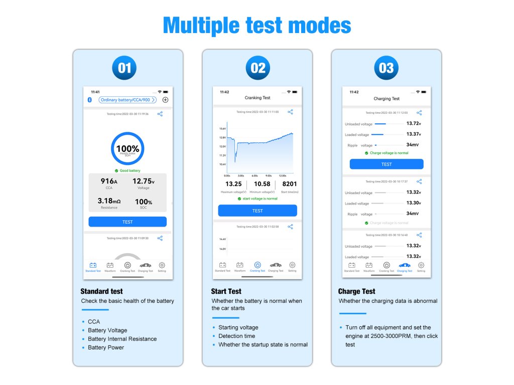 Zaradi napredne tehnologije Bluetooth tester baterij Konnwei omogoča celovito analizo stanja vašega akumulatorja. Lahko preverite splošno zdravje baterije, izvedete test zagona in natančno spremljate postopek polnjenja. Tester zagotavlja natančne podatke o napetosti, notranjem uporu, zmogljivosti zagona v mrzlem stanju, zdravju baterije in statusu polnjenja.