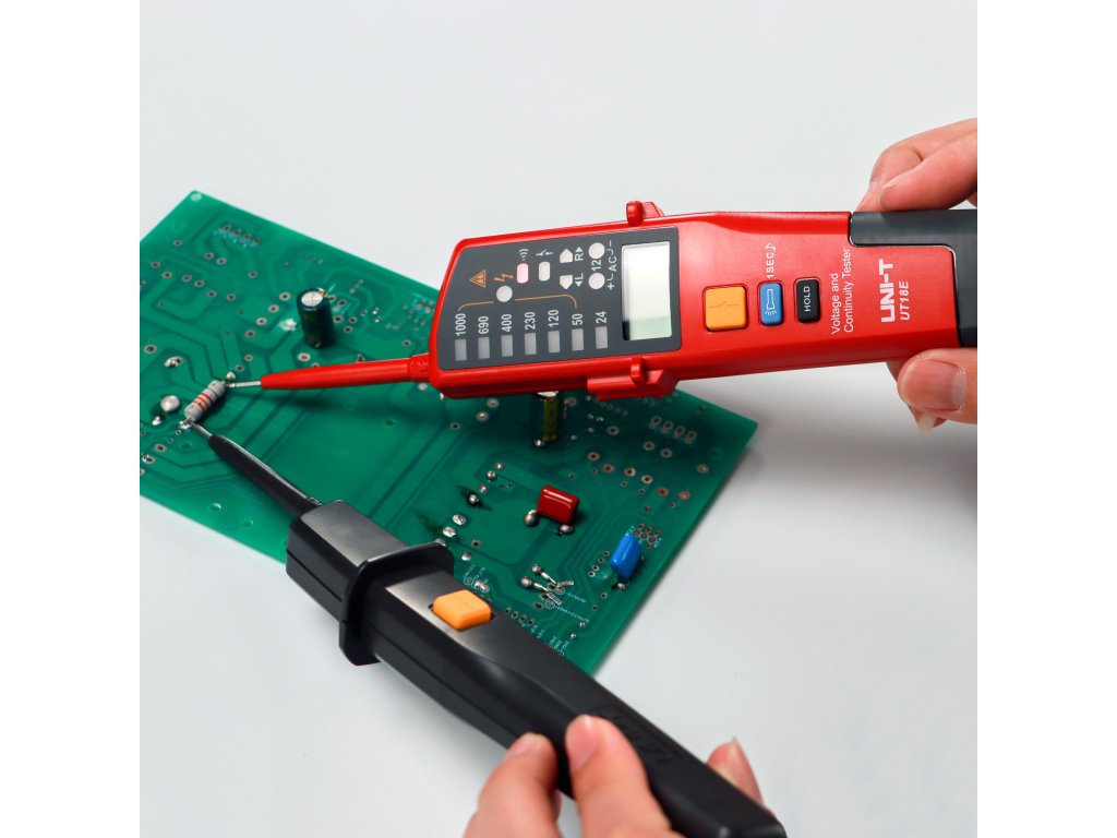 UT18E ponuja merjenje napetosti v širokem razponu od 6 V do 1000 V z visoko natančnostjo, ki se spreminja glede na obseg: od ±(1,5%+1) za 6 V do ±(1,5%+5) za 1000 V. Poleg standardnega merjenja napetosti merilnik omogoča testiranje zaporedja faz, kontrole zveznosti kroga (do 60 k?) ter detekcijo polaritete. Vgrajeni zvočni signal in LED kazalniki olajšajo delo, funkcija testiranja RDC (230 V, 50 Hz ~ 400 Hz) pa povečuje vsestranskost.