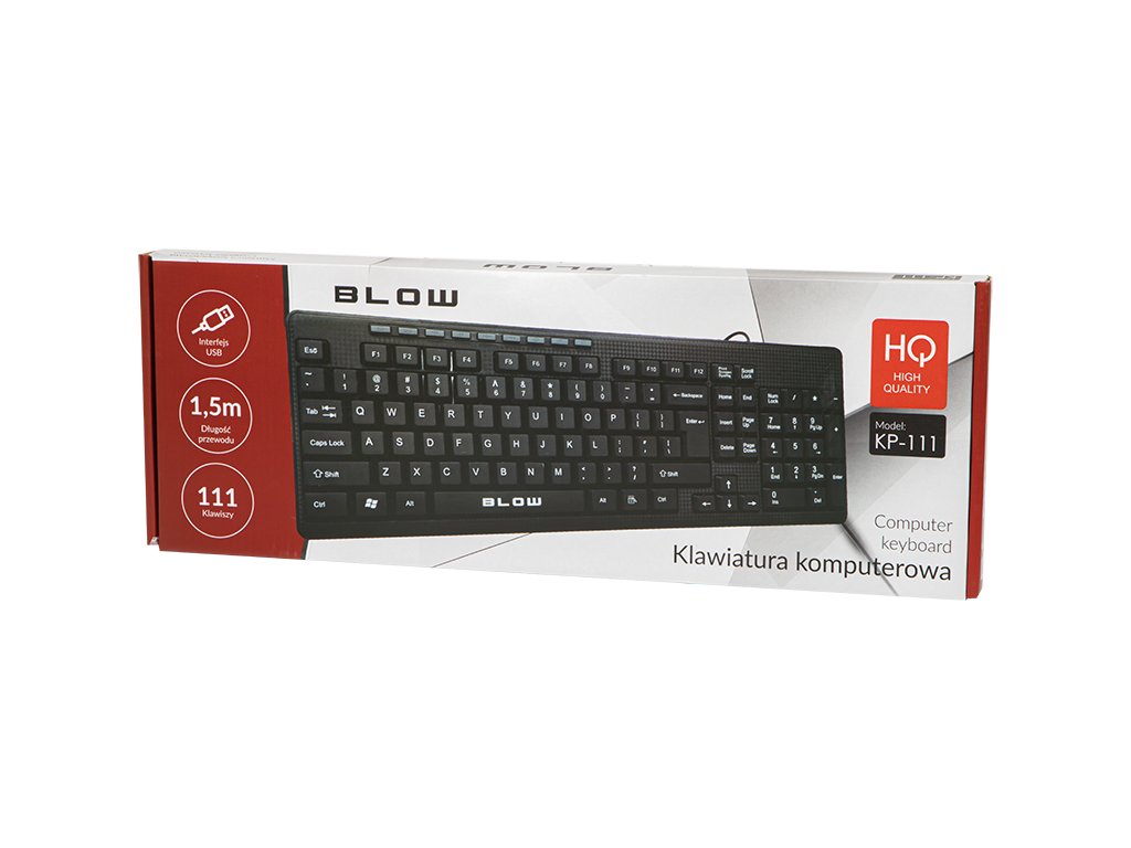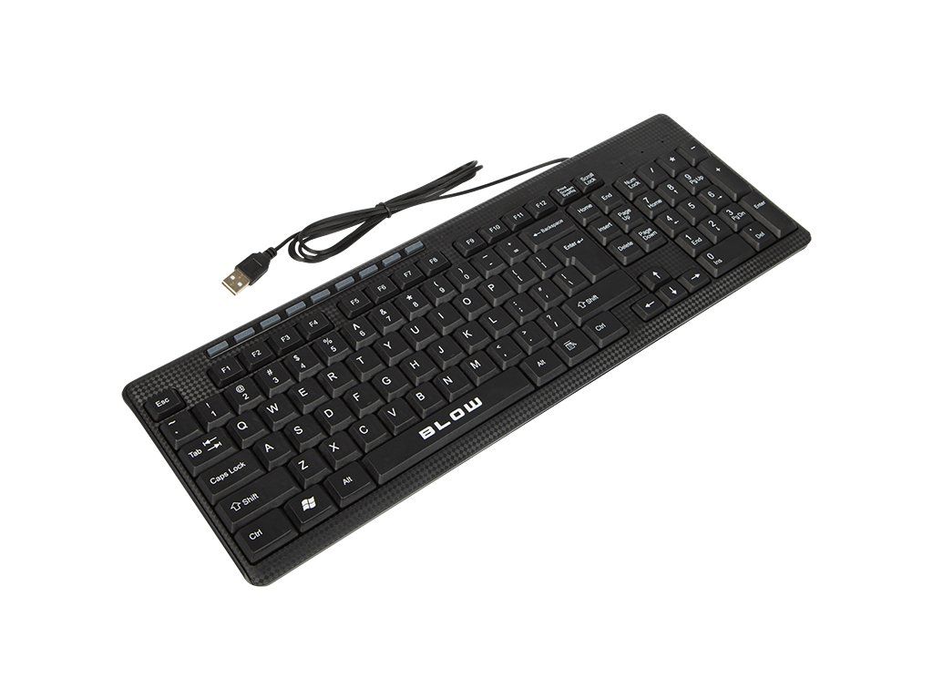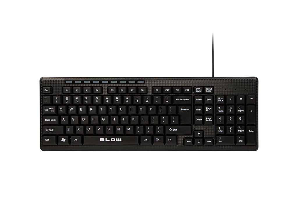 Žična tipkovnica znamke Blow z vmesnikom USB, zgrajena iz visokokakovostnih materialov s povečano odpornostjo proti vlagi. Uporaba najbolj priljubljene razporeditve tipk QWERTY in ločena numerična tipkovnica omogoča enostavno pisanje. Prilagodljive zadnje nogice omogočajo nastavitev naklona tipkovnice po željah uporabnika. Poleg tega ima devet dostopnih tipk.