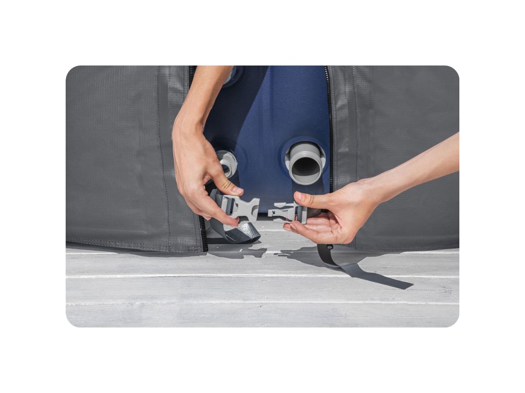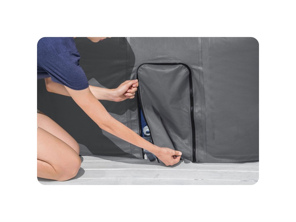 Pokrov je opremljen z zadrgo za priključitev črpalke. Njegova prednost je lahka in intuitivna montaža. Narejen je iz trdnega materiala. To je eden od pomembnih elementov, ki pomaga prihraniti vaš denar! Če sanjate, da bi bilo vaše SPA hitro pripravljeno za uporabo, ne oklevajte pri nakupu.