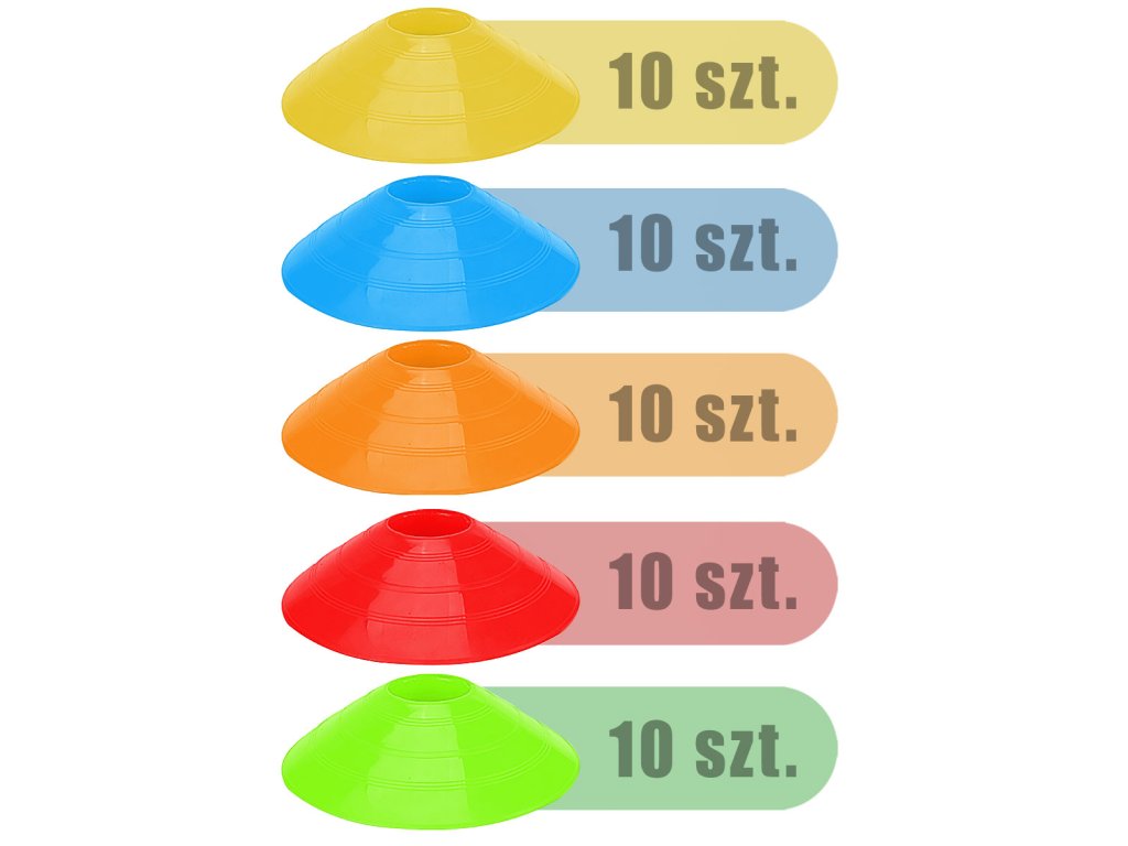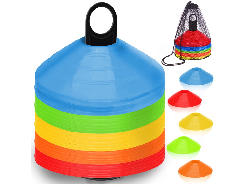 Komplet 50 treningovih stožcev v petih barvah – idealen za treninge na igrišču in v naravi! Izstopajoče barve zagotavljajo odlično vidljivost, in lahkotna konstrukcija olajša hitro nastavitev na različnih površinah.