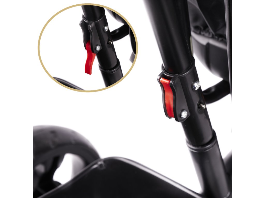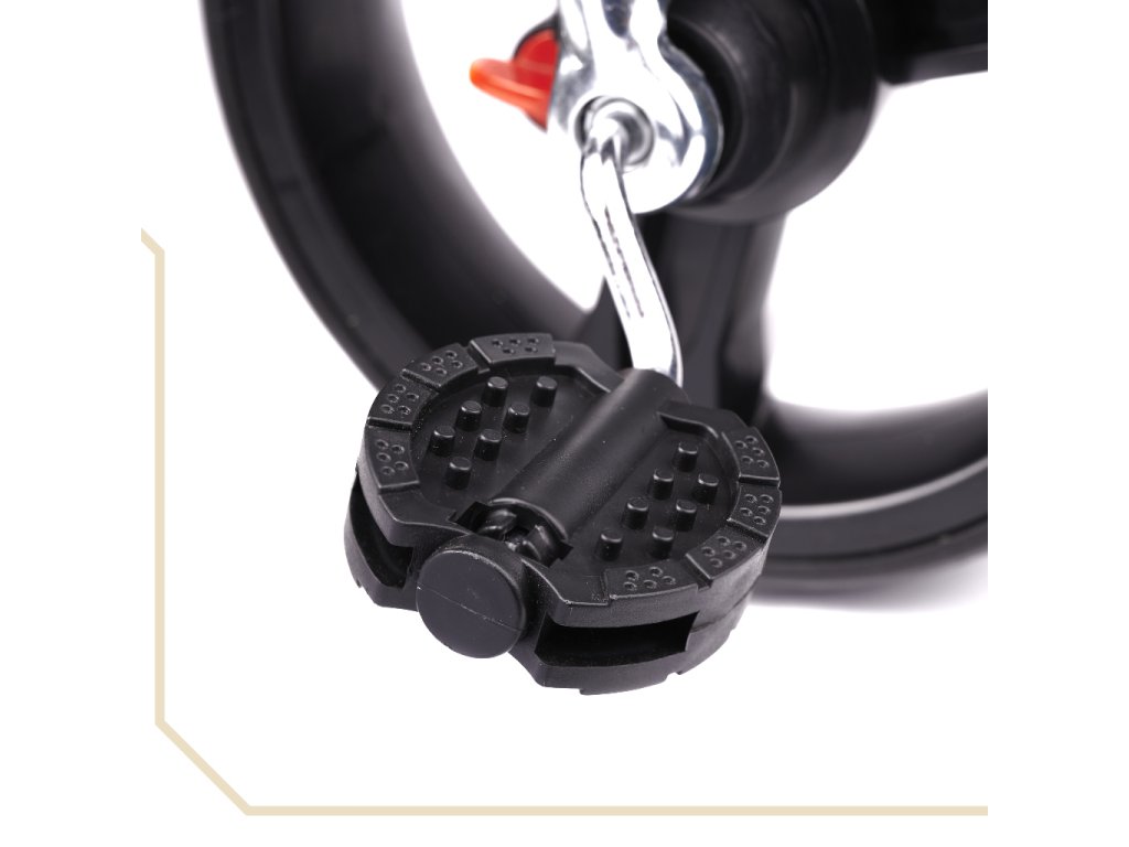 Kolo je opremljeno s poklopnimi oporami za noge za manjše otroke, varnostnim pasom in varnostno ograjo. Oporne noge in varnostno palico je mogoče odstraniti, ko je vaš otrok nekoliko starejši, začne se učiti voziti in doseže ročaje in pedale na sprednjem kolesu.