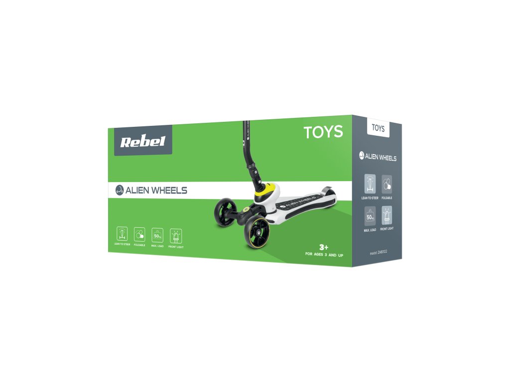 Se sprašujete, kateri skiro bi bil najboljši za otroka? Odločite se za Rebel Alien Wheels! 3 kolesa, lahka konstrukcija in uporaba balansnega mehanizma zagotavljajo večjo stabilnost in nadzor med vožnjo. Vse to pomeni, da se ta model izkaže že kot skiro za triletnike. Pomembno je, da je Alien Wheels na voljo v dveh barvnih različicah, zato bo vaš otrok zagotovo našel model, ki mu ustreza.