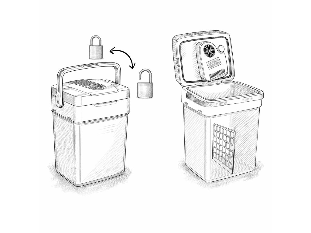 Hladilnik ima praktičen blokirni sistem – ko je ročaj nastavljen navpično (v položaju prenašanja), pokrov ostane zaprt. To prepreči nenamerno odpiranje med prevozom.