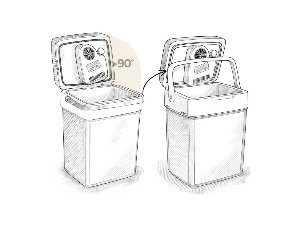 Hladilnik ima praktičen sistem zaklepanja – ko je držalo nastavljeno vertikalno (v nosilnem položaju), pokrov ostane zaprt. Tako se med prevozom ne odpre po nesreči.