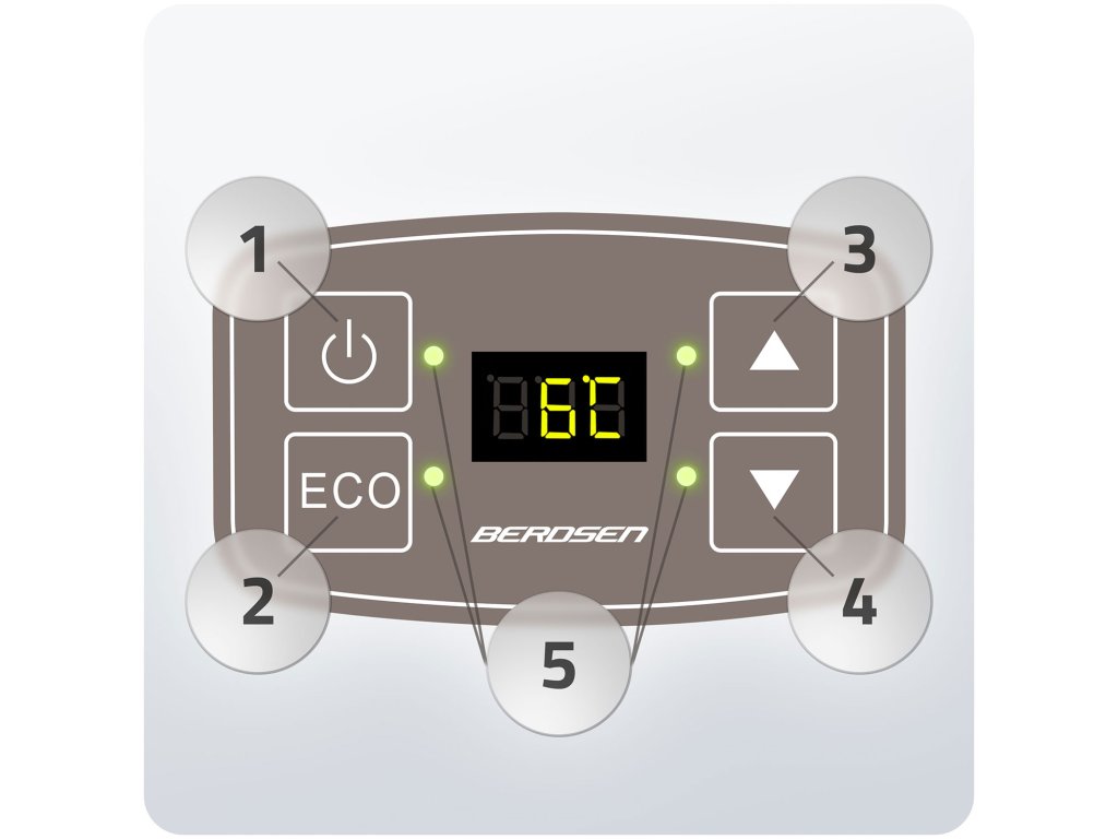 - Način Eco se aktivira po doseženju nastavljene temperature, kar zmanjšuje porabo toka. Če temperatura naraste, se naprava samodejno preklopi nazaj v način Normalno.