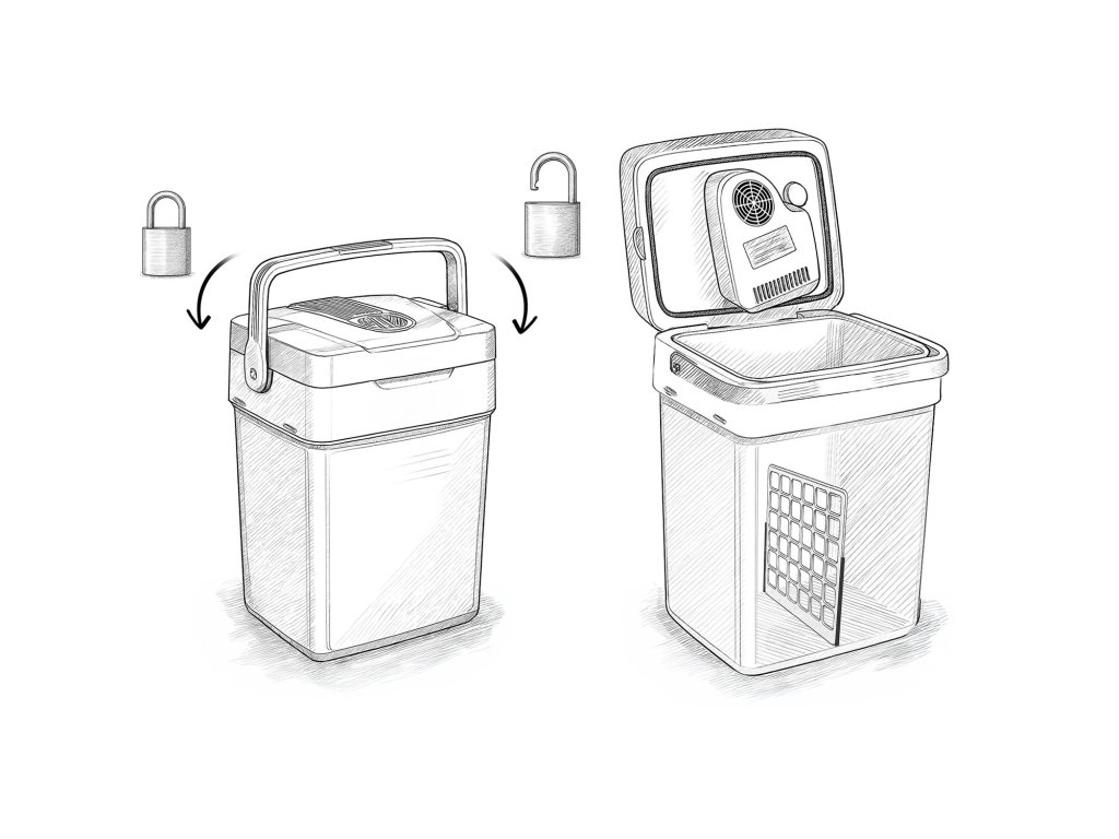 Hladilnik ima praktičen sistem zaklepa – ko je ročaj nastavljen navpično (v prenosnem položaju), pokrov ostane zaprt. Zaradi tega se ne bo nehote odprl med transportom.