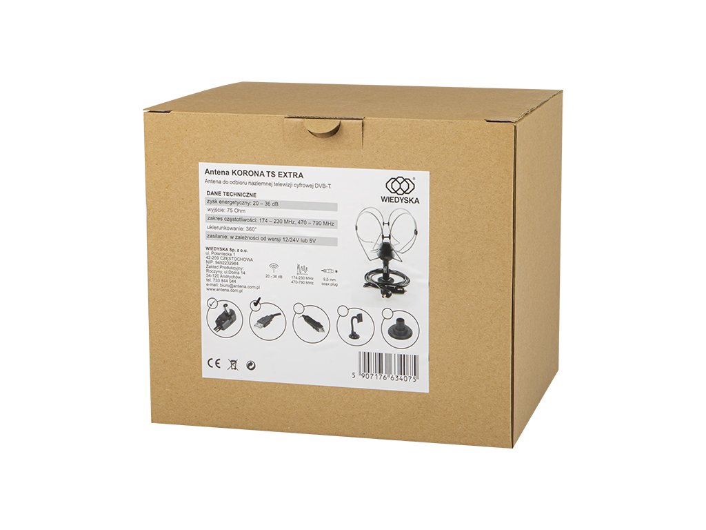 Antena za sprejem digitalne prizemne televizije nove generacijeKorona TS Extra USB ima sodoben ojačevalnik, ki omogoča dober sprejem analognih in digitalnih DVB-T) digitalnih in analognih prizemnih televizijskih programov ter radijskega oddajanja v pasu FM od 40 do 850 MHz. Prednost antene so njene majhne dimenzije in nizka teža, kar omogoča montažo na različna mesta – predvsem na avtomobile, jahte, poletne hiše ali prikolice. Zelo pomembna prednost antene so njene vsesmerne lastnosti, kar v praksi pomeni, da ni potrebno, da je usmerjena proti oddajniku.Tehnični podatki:- frekvenčni razpon: 174 – 230 MHz, 470 – 862 MHz- smer: 360°- napajanje: 5V iz USB vtičnice 30 mA DC- energijski dobiček: 20-30 dB- izhod: 75 Ω.