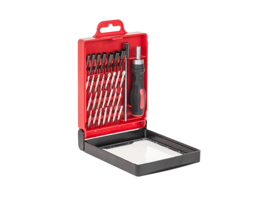 Natančni izvijači iz kaljenega, popuščenega jekla, plastična škatla. Uporaba: natančna elektronika, računalniki, itd. Vsebina: T5, T6, T7, T8, T9, T10, T1%, T20, T25 SL2.0, SL3.0, SL4.0mm PH000, PH00, PH0, PZ0, PZ1 H1.5, H2.0, H2.5, H3.0mm, 4mm 7 mini vtičnic 2.5-3-3.5-4-4.5-5-5.5mmNatančni izvijači iz kaljenega, popuščenega jekla, plastična škatla.