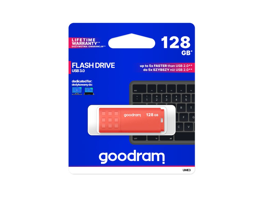 UME3 ima klasičen dizajn, ki ga moti intenzivnost barv ohišja. Pokrovček z izbočeno protizdrsno teksturo omogoča enostavno odpiranje USB-ja v katerem koli položaju. Ko odstranite pokrovček, ga lahko namestite na drugo stran ohišja, da zagotovite, da se ne izgubi. Idealno za tiste, ki imajo radi svoje USB ključke vedno pri roki, saj so opremljeni s perforacijo za pritrditev obeska.Pomnilniški pogon UME3 je na voljo v kapacitetah od 16 GB do 128 GB. Uporabljene komponente omogočajo hitrost branja do 60 MB/s in hitrost zapisovanja do 20 MB/s. Tako kot za vse druge GOODRAM USB ključke velja za UME3 doživljenjska garancija proizvajalca.