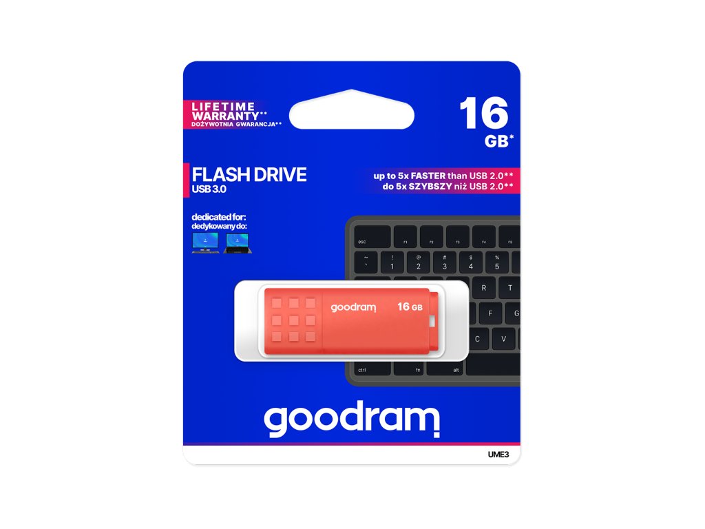 UME3 ima klasičen dizajn, ki ga zmoti intenzivnost barv ohišja. Pokrovček z izbočenim protizdrsnim vzorcem olajša odpiranje USB v vsaki situaciji. Ko odstranite čep, ga lahko postavite na drug konec ohišja, da zagotovite, da se ne izgubi. Idealno za tiste, ki radi nosijo USB ključke vedno s seboj, saj so opremljeni z luknjo za pritrditev obeska. Pomnilniški disk UME3 je na voljo v kapacitetah od 16 GB do 128 GB. Uporabljene komponente omogočajo hitrost branja do 60 MB/s in hitrost zapisovanja do 20 MB/s. Tako kot za vse druge USB ključke GOODRAM velja tudi za UME3 doživljenjska garancija proizvajalca.