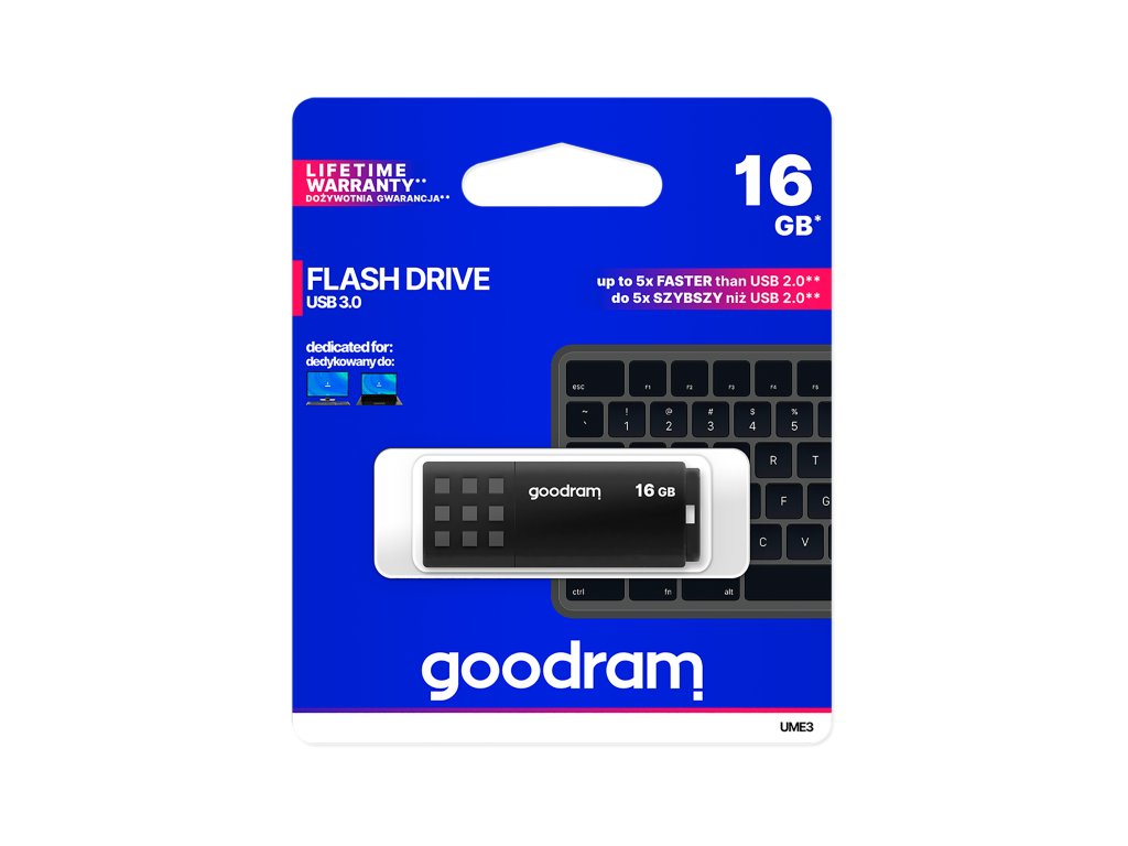 UME3 ima klasičen dizajn, ki ga razbijajo intenzivne barve ohišja. Čep z izbočenim proti zdrsnim vzorcem omogoča enostavno odpiranje USB-ja v kateri koli situaciji. Po odstranitvi čepa ga lahko namestite na drugi konec ohišja, da zagotovite, da se ne izgubi. Idealen je za tiste, ki imajo radi svoje USB ključke vedno pri sebi, saj so opremljeni s perforacijo za pritrditev obeska. Pomnilniški disk UME3 je na voljo s kapacitetami od 16 GB do 128 GB. Uporabljene komponente omogočajo hitrost branja do 60 MB/s in hitrost pisanja do 20 MB/s. Tako kot vsi drugi USB-ključki GOODRAM ima tudi UME3 doživljenjsko garancijo proizvajalca.