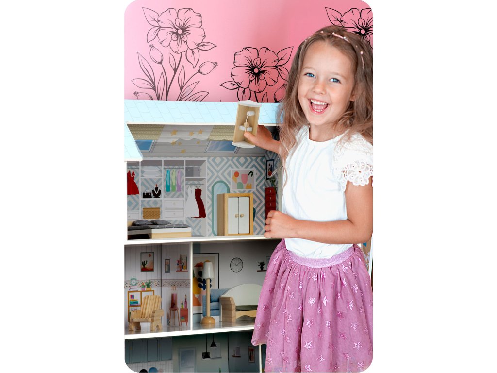 Velika, lepa hišica za punčke s pohištvom je ključ do sveta domišljije in radosti! Zahvaljujoč njej lahko tvoja deklica: