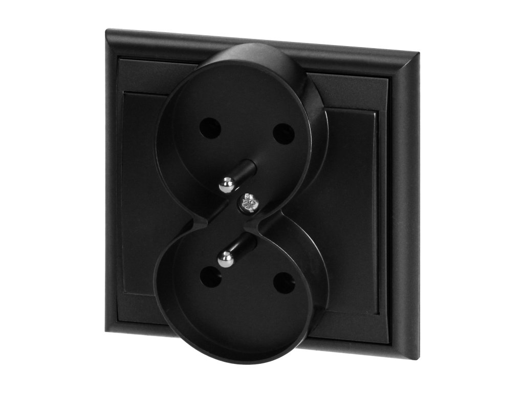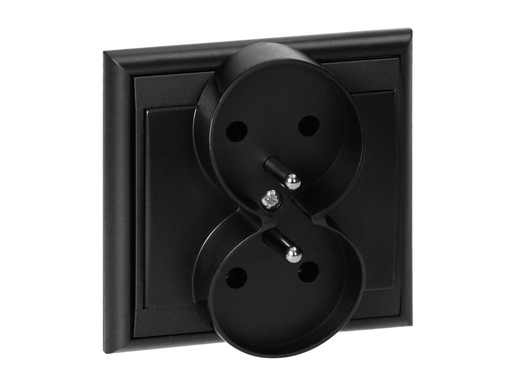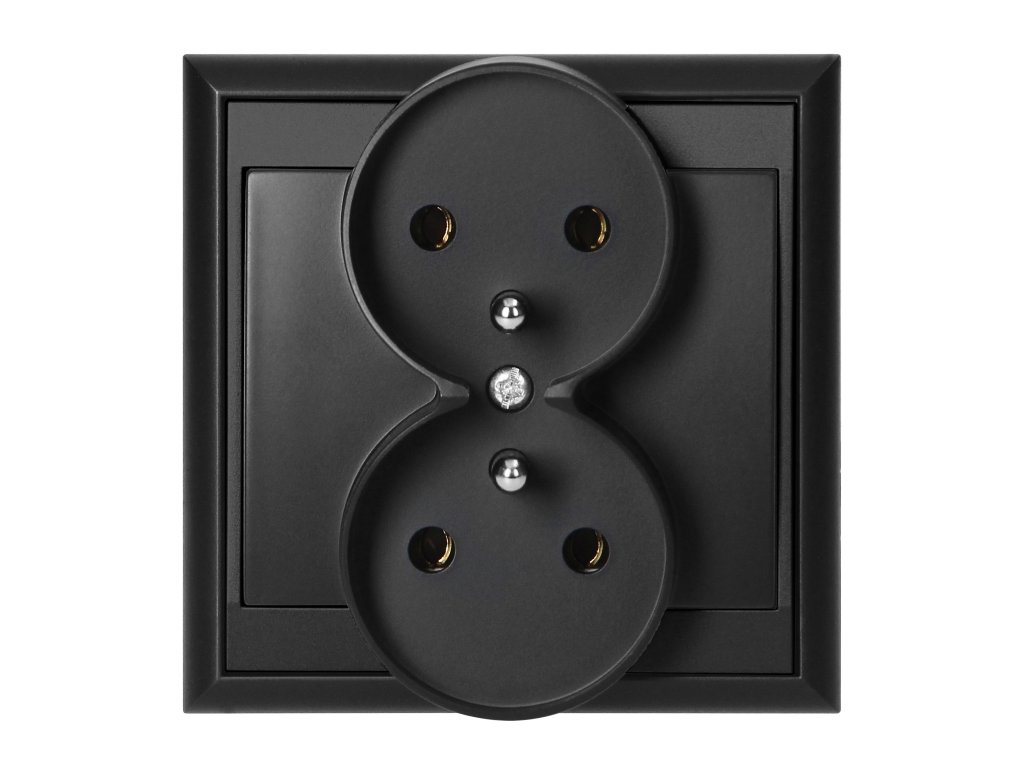 Dvojna francoska vtičnica, 2x2P+E. Zasnovana za vgradnjo v sistem okvirnih plošč. Uporabljati jo je treba v zaprtih prostorih (IP20).