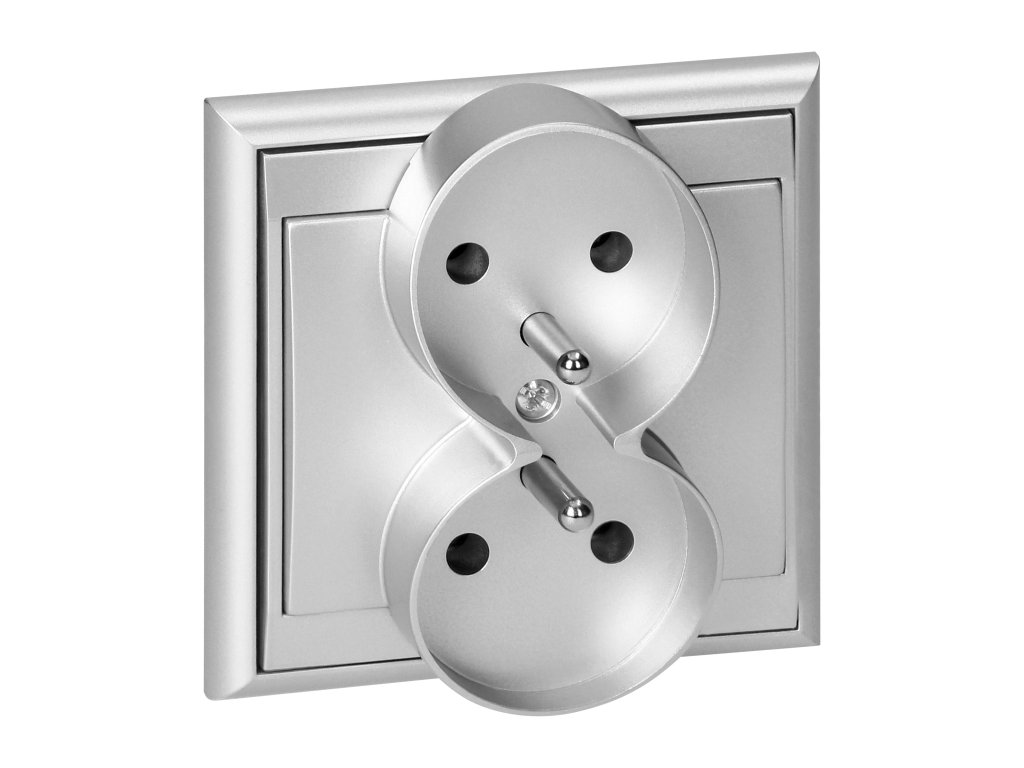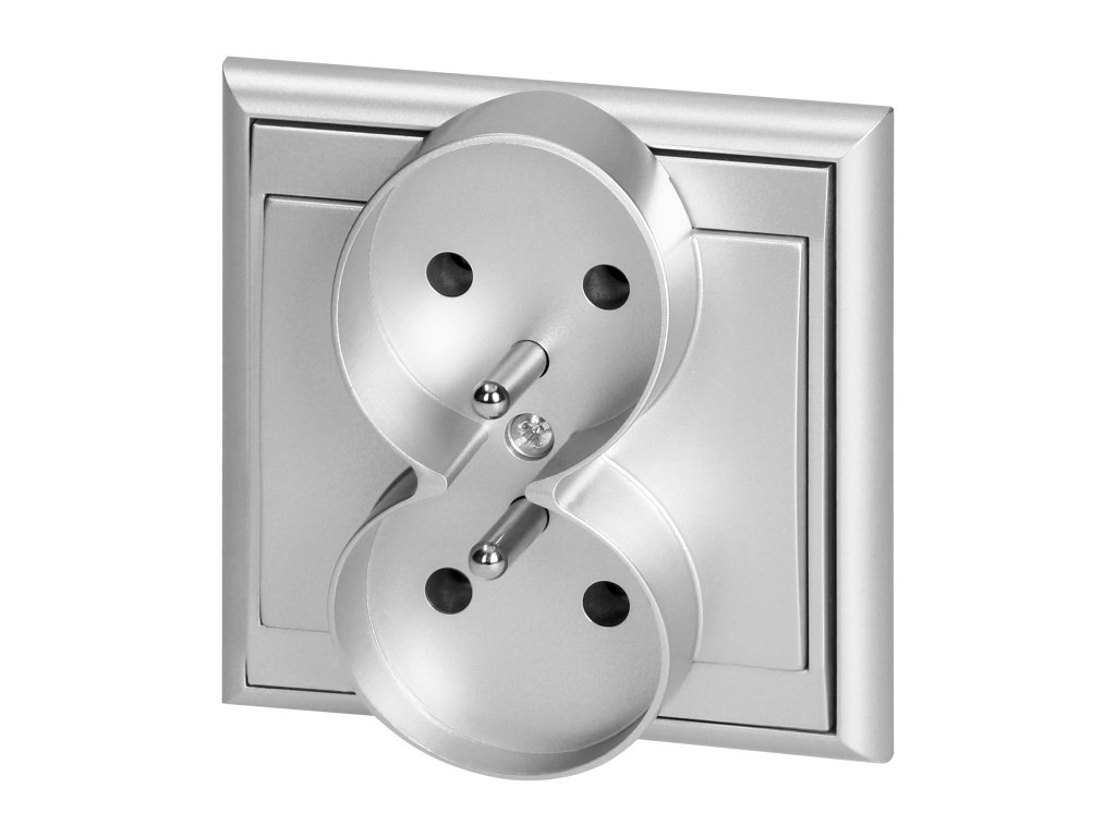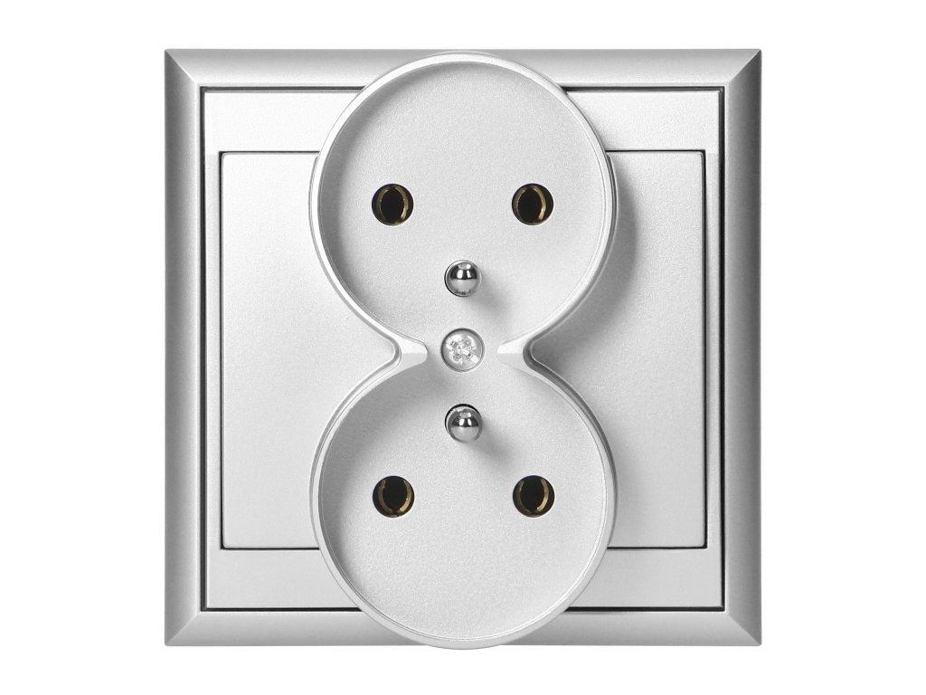 Dvojna francoska vtičnica, 2x2P+E. Namenjena je za montažo v ravnini s sistemom okvirnih plošč. Uporabiti jo je treba v notranjosti (IP20).