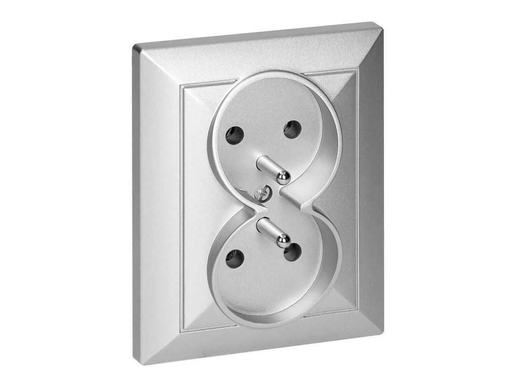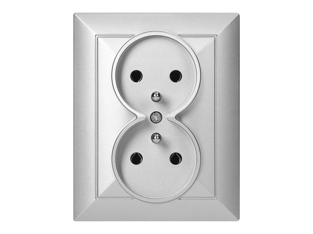 Modularna serija s simetričnim sistemom okvirne plošče (za 1-, 2-, 3-, 4-, 5-modulov), ki omogoča montažo izdelka v vodoravnem in navpičnem položaju. Sodobni mehanizem hitre povezave (žice so povezane z neposrednim potiskom v telo) zagotavlja varno in zanesljivo namestitev in odstranitev žic. Vtičnice so opremljene s tradicionalnimi vijačnimi povezavami. Notranja zasnova terminalov zagotavlja zanesljivo povezavo žic od 0,75 mm? do 2,5 mm?. Močna in robustna montažna mreža plošč ter visokokakovostni samopovratni elementi omogočajo stabilno in varno namestitev v škatli. Posebni vzmetni elementi olajšajo namestitev okvirja v telo.Dvojna francoska vtičnica, 2x2P+E. Namenjena za vgradno montažo. Uporablja naj se v notranjih prostorih (IP20).