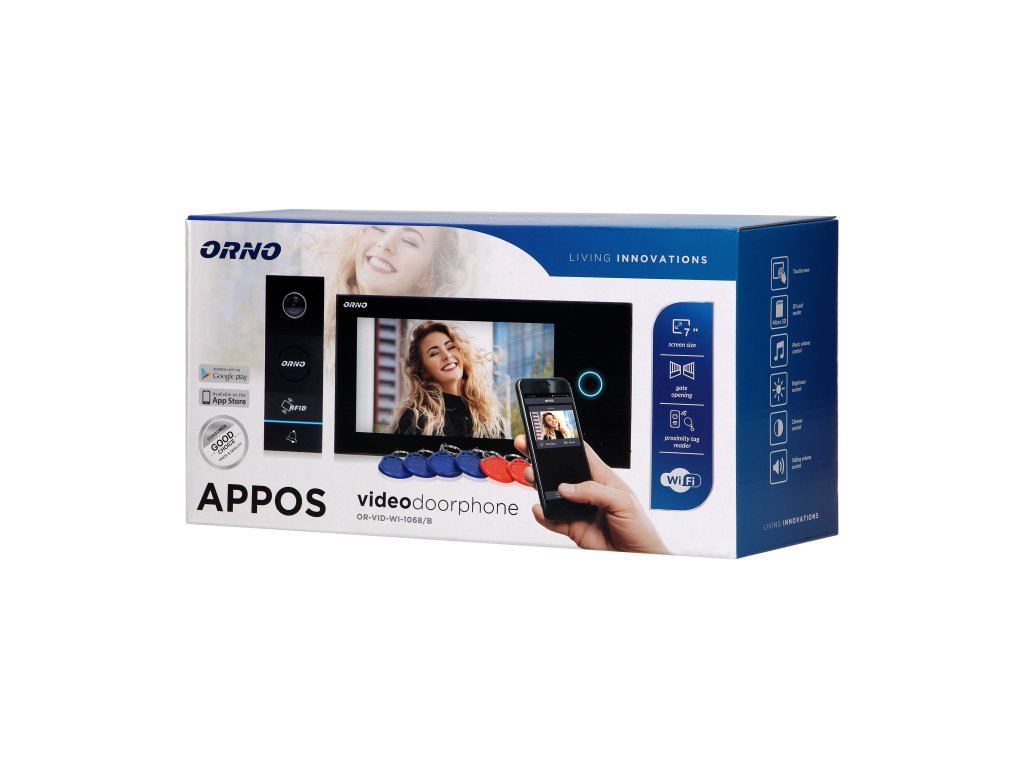 Inovativni komplet video domofona APPOS vsebuje barvni 7" LCD monitor in zunanjo širokokotno videokamero. Komunikacija med notranjo in zunanjo ploščo ne zahteva nobenega telefona. Uporabniki si lahko prenesejo brezplačno aplikacijo za upravljanje naprave neposredno s svojega pametnega telefona Ima čitalnik kartic in brezkontaktnih oznak za prijavo samo pooblaščenih uporabnikov Komplet omogoča odpiranje ključavnic vrat in vrat Možno ga je razširiti z dodatnimi enotami APPOS.