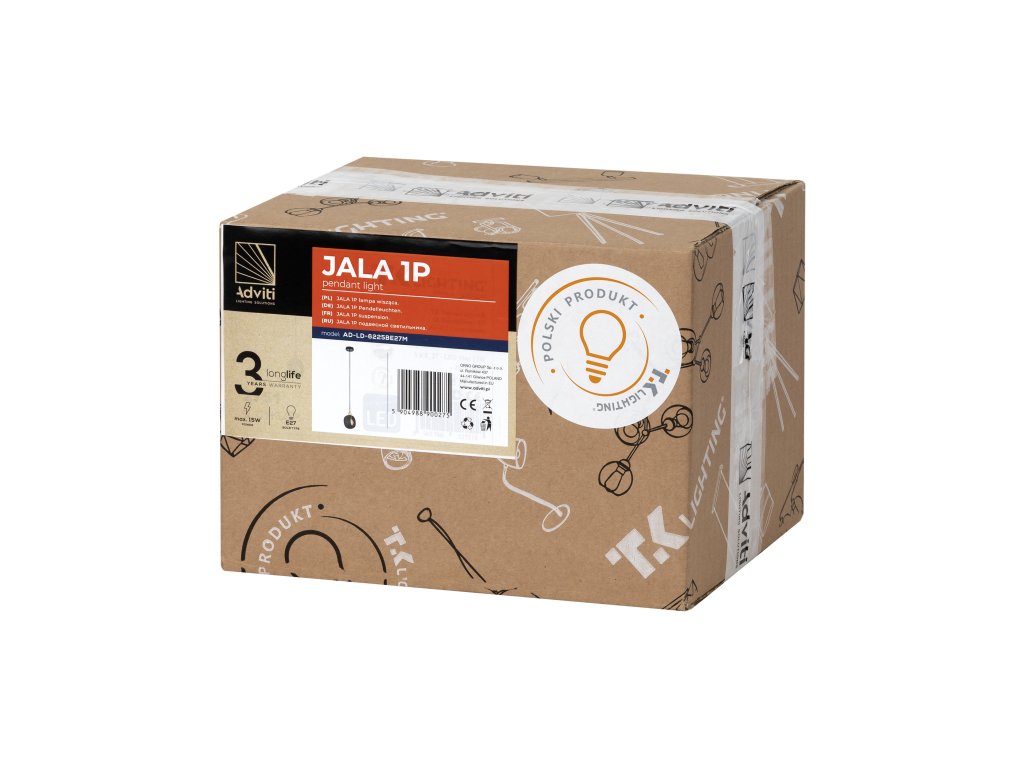 Lestenec na vrvici JALA je zasnovan v sodobnem slogu. Okrogla senčna kapa iz kovine po dizajnu spominja na Kiklopovo oko, kar ji daje zanimiv in edinstven videz. Svetilka je namenjena za svetlobni vir z grlom E27, svetlobni vir ni vključen v paket. Svetilka je na voljo v črni barvi. Družino dopolnjuje tudi različica s tremi in šestimi svetlobnimi viri.