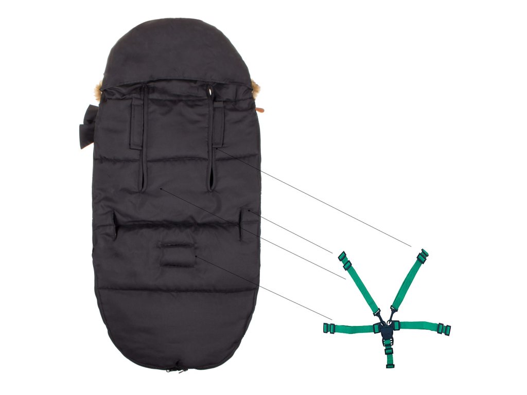 Na zadnji strani: 2 veliki razporki/odprtini zaprti z 2 ježkoma + 4 dodatni razporki – za sedež/montažne pasove – razporejeni tako, da se prilegajo različnim pasom