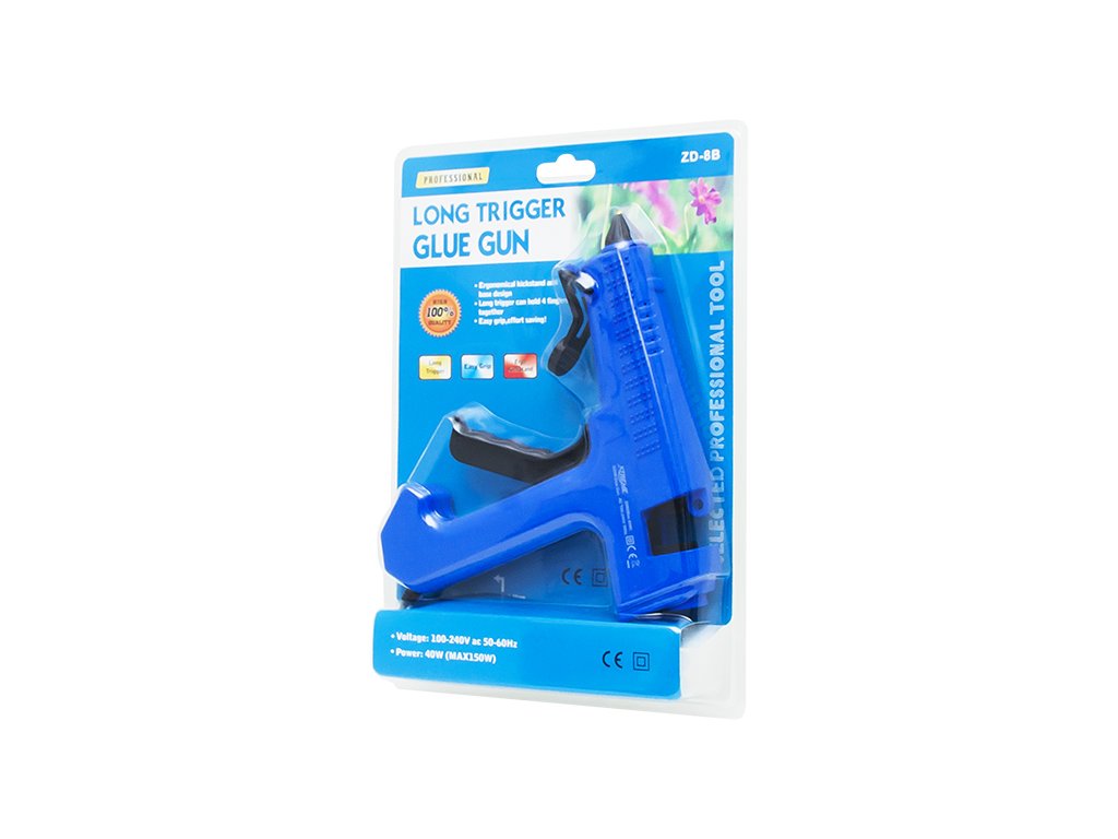 Pištola/pištola za enokomponentno lepilo, ki se raztaplja pri temperaturi. S pomočjo pištole in termičnega lepila lahko lepite les, steklo, keramiko, kovine, plastiko in mnoge druge stvari. Lepljiva pištola je nepogrešljiva za hobi, dekorativna dela ipd.