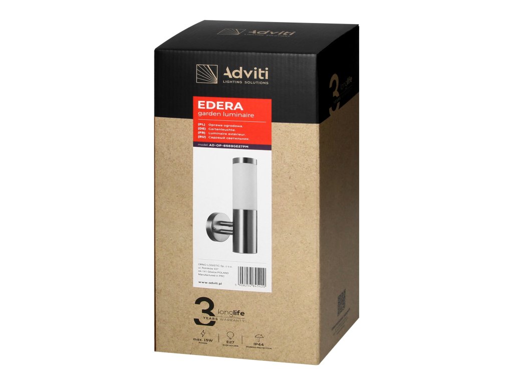 Svetilka za vrt EDERA spada v serijo zunanjih svetil, ki vsebuje dva tipa stenskih svetilk in svetilko na stebričku, kar omogoča ustvarjanje skladne vrtne osvetlitve. Serija je bila zasnovana z mislijo na estetiko, trajnost in funkcionalnost. Zaradi tega se odlično obnese kot dekorativen in funkcionalen element.EDERA je izdelana iz nerjavečega jekla, kar zagotavlja dolgotrajno obstojnost. Stopnja zaščite IP44 ščiti svetilko pred prahom in vodo, zato lahko svetilke namestite na prostem ne glede na zahtevne vremenske pogoje. Dodatno visok standard zaščite pred udarci IK08 ščiti svetilko pred zunanjimi dejavniki.