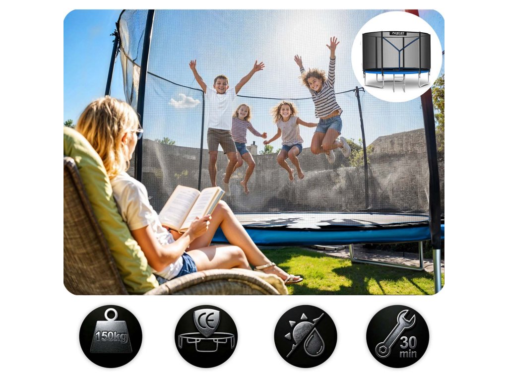 - v paketu: vrtna trampolina, varnostna mreža, kovinska lestev, navodila za uporabo