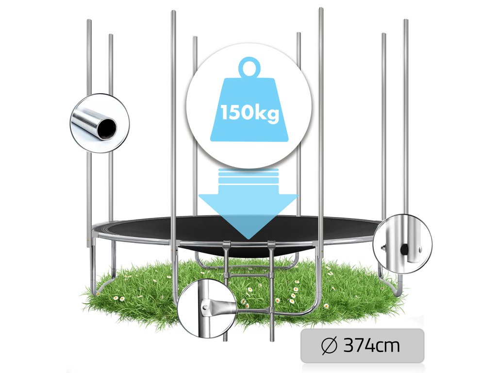 - trampolin 374 cm (12 ft) na 4 dvojnih nogah,