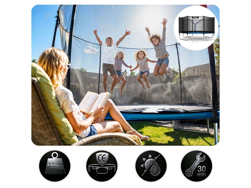 - v kompletu: vrtna trampolin, varnostna mreža, kovinske lestve, navodila za uporabo