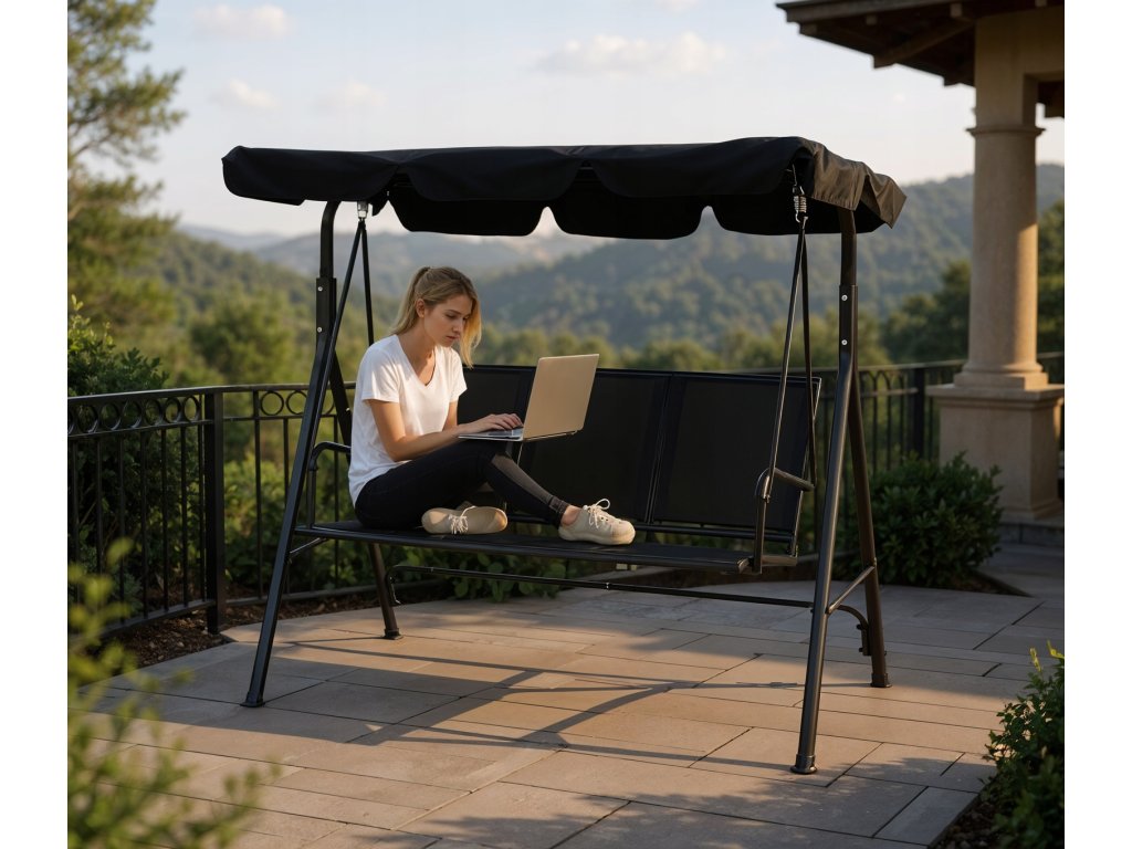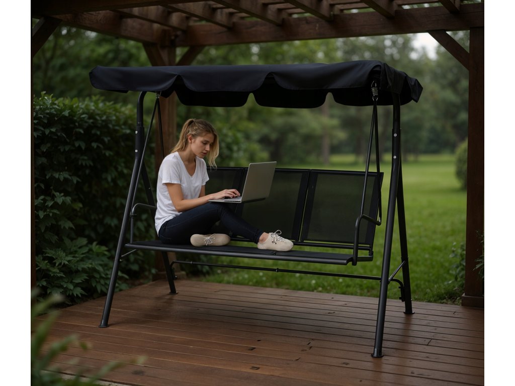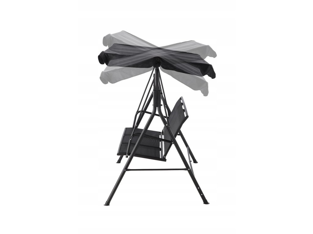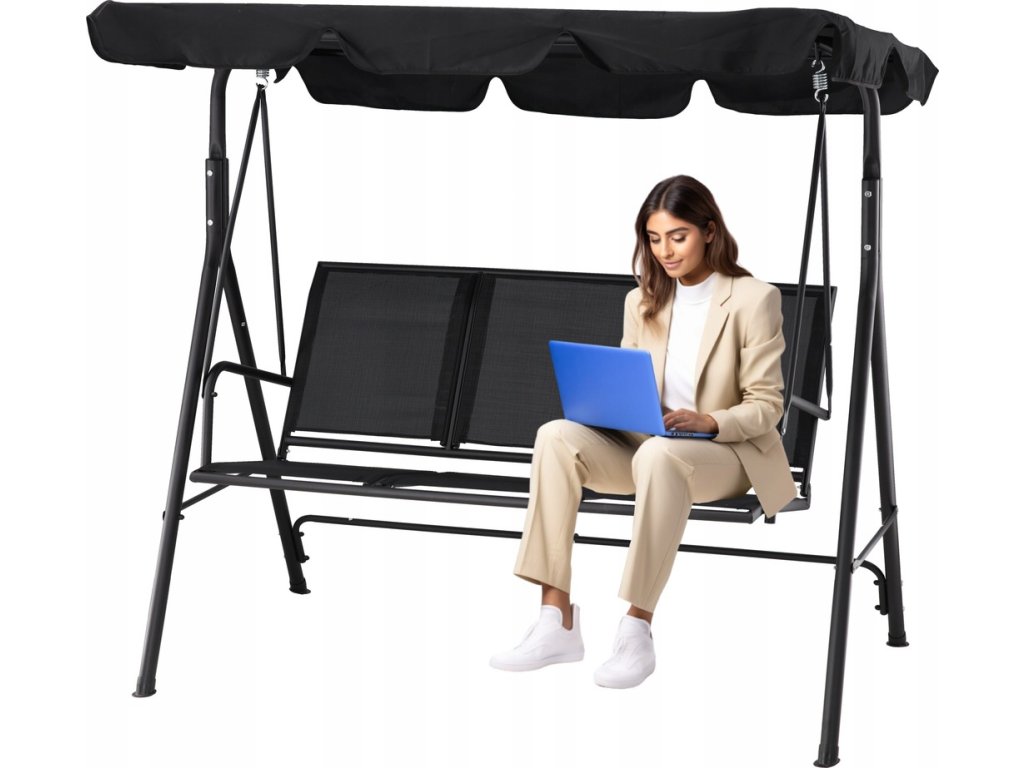 Elegantna in udobna vrtna hujačka, idealna za sprostitev na prostem. Opremljena z veliko nastavljivo streho, ki ščiti pred soncem, in trpežnim sedežem iz materiala tekstilene, odpornega na vremenske vplive. Stabilna jeklena konstrukcija in obešanje na kovinskih vzmeteh zagotavljajo udobje pri uporabi in dolgo življenjsko dobo.