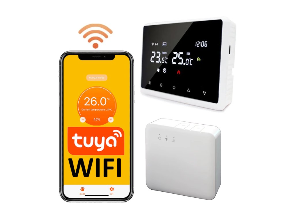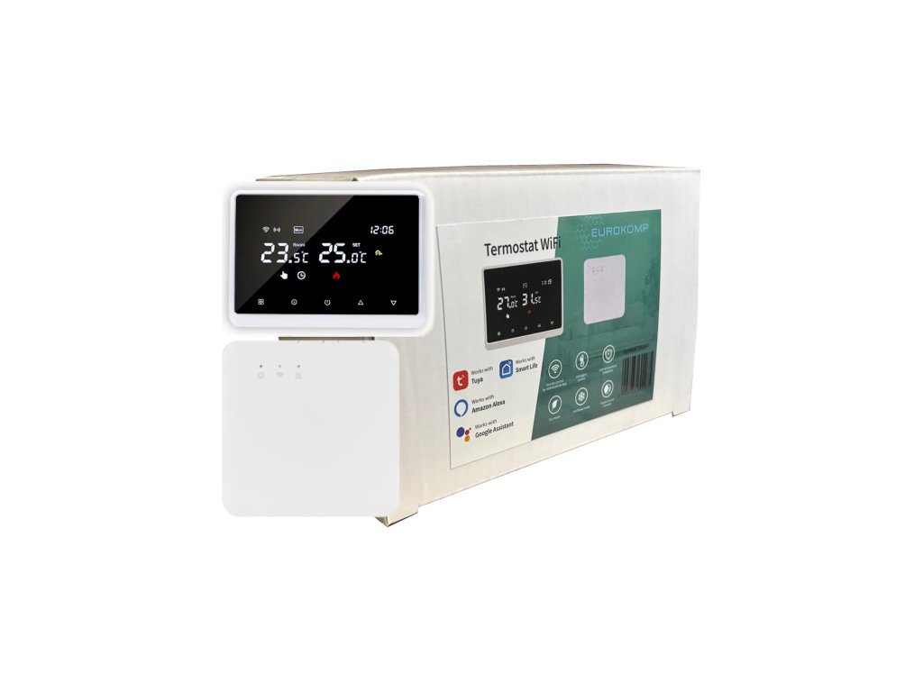 Termostat EUROKOMP model E6264 je sodobna naprava, zasnovana za učinkovito upravljanje temperature v vašem domu. Zahvaljujoč integraciji z aplikacijo Tuya Smart omogoča daljinsko upravljanje sistema ogrevanja, kar zagotavlja udobje in varčevanje z energijo.