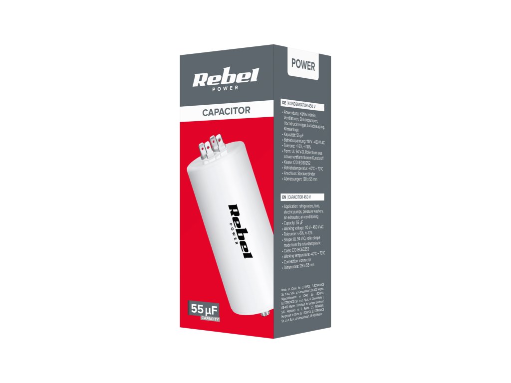 Kondenzator 55uF 450V je ključna komponenta za podporo delovanja enofaznih motorjev v različnih gospodinjskih in industrijskih napravah. Njegova zanesljivost in vzdržljivost ga naredita idealno izbiro za hladilnike, ventilatorje, električne črpalke, čistilce, zračnike ter klimatske naprave. Ta kondenzator je zasnovan z mislijo na stabilnost delovanja in dolgo življenjsko dobo.