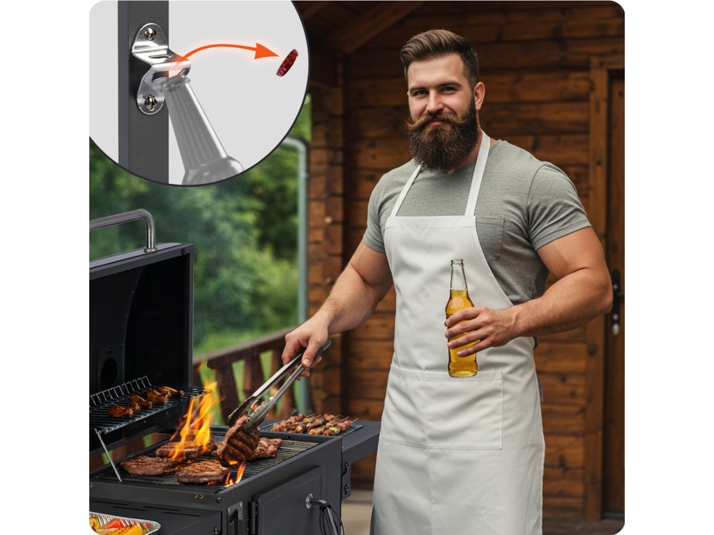 Poleg tega ima vgrajen odpirač za pijače, saj je znano – hladen napitek v rokah je osnova. Stil, udobje in popolna sprostitev pri žaru!