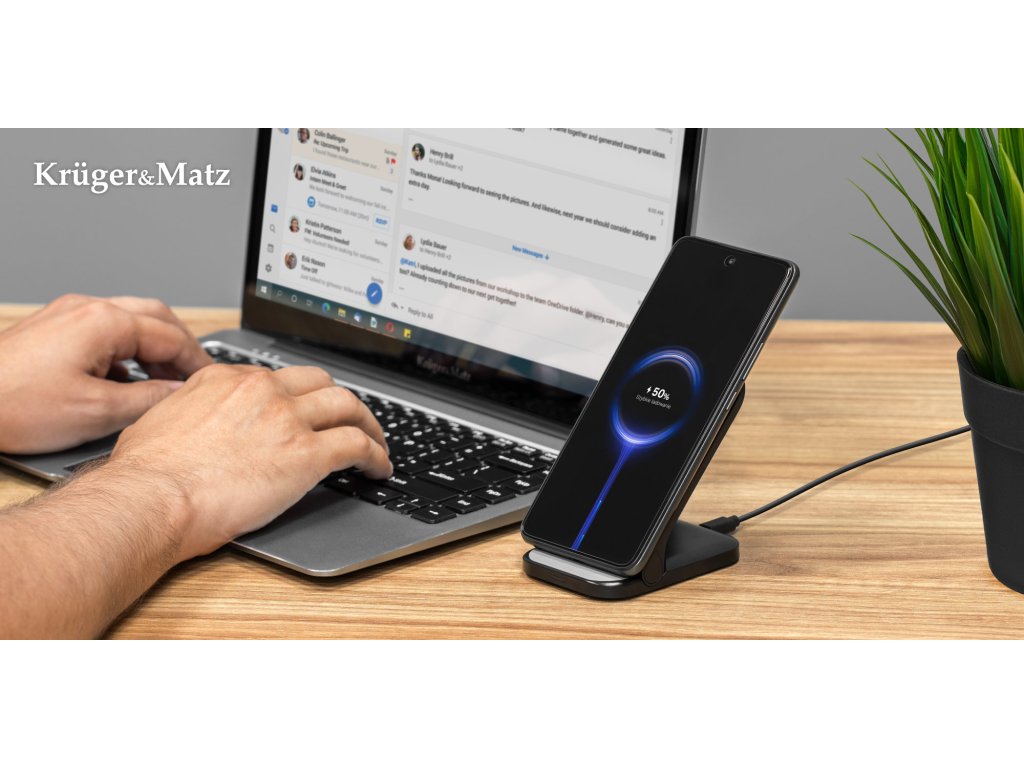 Brezžični polnilnik Kruger&Matz je popolna kombinacija moderne tehnologije in funkcionalnega dizajna. Z njim postane polnjenje pametnega telefona ali druge mobilne naprave preprosto in udobno. Dovolj je, da ga postavite na stojalo in postopek se bo začel samodejno.