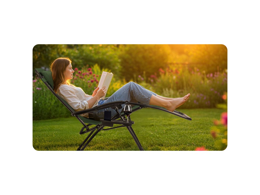 Gravitacijski ležalnik z blazino in mini mizico je naložba v udobje in sprostitev v vsakodnevnem počitku na svežem zraku.