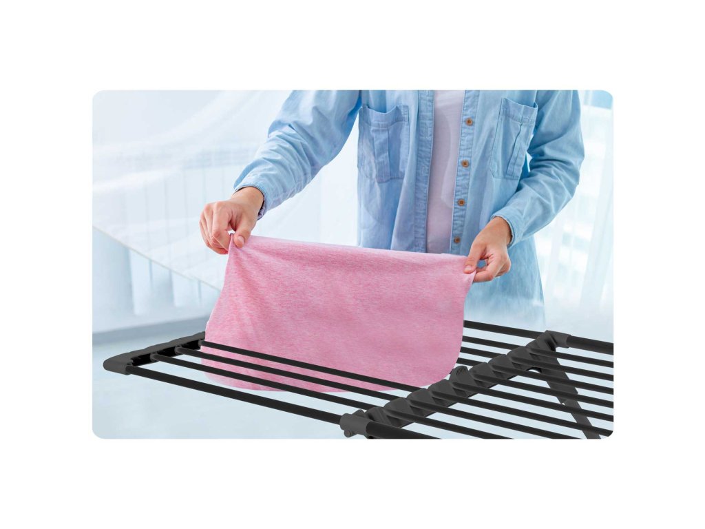 Zahvaljujoč ustreznim razmakom med vrvmi se voda hitro izhlapeva in perilo bo enakomerno posušeno in pripravljeno za zlaganje!