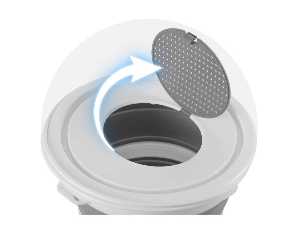 Po pranju se vedro zlahka izprazni zahvaljujoč ročaju in loputu s cedilom, pri čemer odvaja vodo brez razlitja. Perilo lahko obesite neposredno iz vedra, kar zmanjša nered in pospeši proces.