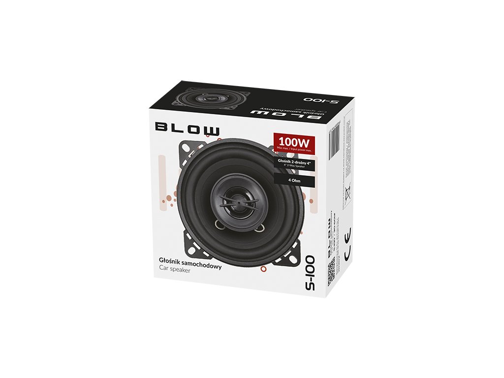 Univerzalni avtomobilski zvočnik 2-sistemski 4" znamke Blow z največjo močjo 100W. Zahvaljujoč visoki kakovosti izdelave in privlačnim barvam se zvočnik popolnoma prilega notranjosti vsakega avtomobila. Izjemno velik premer in dobri parametri komponent zagotavljajo čist in dinamičen zvok ter širok frekvenčni razpon, kar ponuja izjemne glasbene izkušnje.