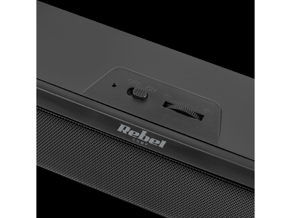 Pozornost si zasluži tudi način priključitve – gre za zvočnik za računalnik na USB. To pomeni, da ne potrebuje dodatnega napajanja iz električnega omrežja, zato ga lahko uporabljate tudi tam, kjer ni dostopa do vtičnice. Poleg tega ima dolg, kar 125-centimetrski kabel, zato lahko mini zvočno vrstico postavite kjerkoli želite. Računalniškega zvočnika Rebel Comp zagotovo ne bodo razočarani tisti, ki cenijo estetiko. Naprava ima elegantno, črno ohišje, pretvorniki pa so osvetljeni rdeče, kar doda zvočniku karakter.
